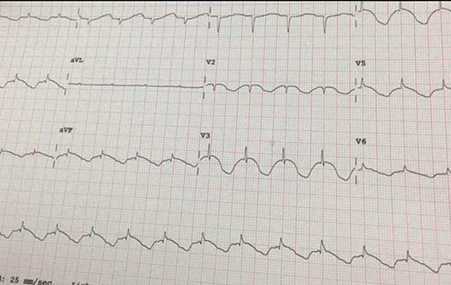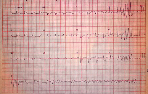Caso esse ECG pertencesse a uma paciente de 40 anos, encontrada desacordada totalmente sem história clínica. Em que patologias devemos pensar?