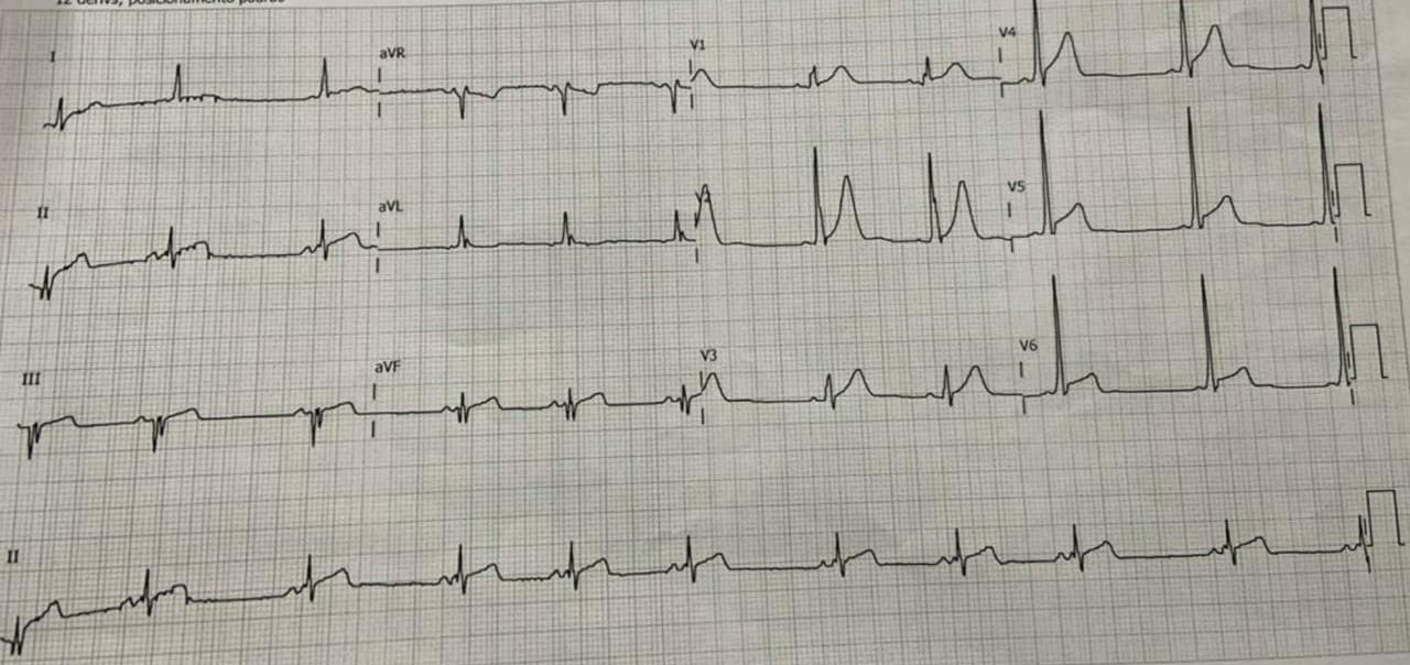 Antes da análise de qualquer eletrocardiograma devemos nos lembrar do contexto. Trata-se de um paciente jovem com uma dor torácica que afasta isquemia miocárdica.