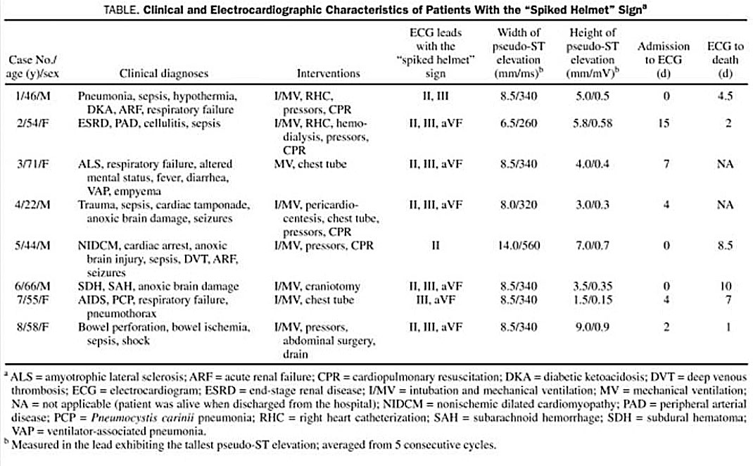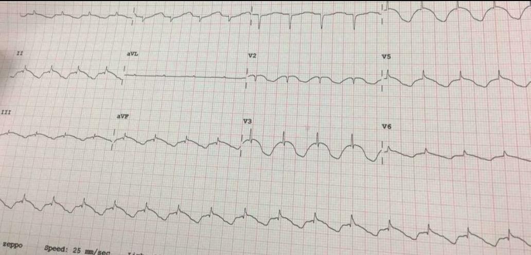 O sinal eletrocardiografico é o chamado "Sinal do Elmo Ponteagudo" que está presente em um grande leque de patologias. No contexto de um paciente sem história clínica e encontrado desacordado deve-se pensar em doenças neurológicas que cursem com disautonomia, como por exemplo uma HEMORRAGIA SUBARACNOIDEA ou um AVC ISQUEMICO extenso.