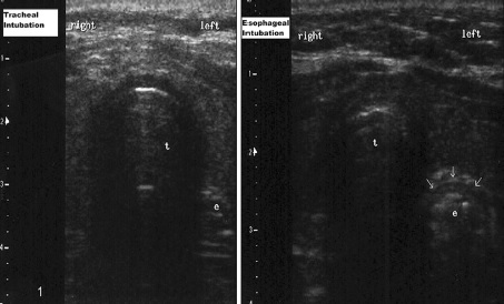 O ultrassom pode ser feito posicionando um transdutor linear ou convexo na topografia da membrana cricotireoidea ou na região da fúrcula esternal, na orientação transversa ou horizontal. A técnica pode ser feita durante a intubação ou após seu término. A visualização do ‘’sinal da tempestade de neve” (snowstorm) ou “sinal da bala” (bullet sign), com o achado de cauda de cometa ou de interface mucosa-aérea com sombra acústica posterior, confirma o correto posicionamento do tubo no interior da traqueia, tendo em vista que o próprio tubo não pode ser visualizado. Se visualizarmos uma dupla interface mucosa-aérea, com sombra acústica posterior, indica intubação esofágica, com a visualização do espaço paratraqueal à esquerda deste.