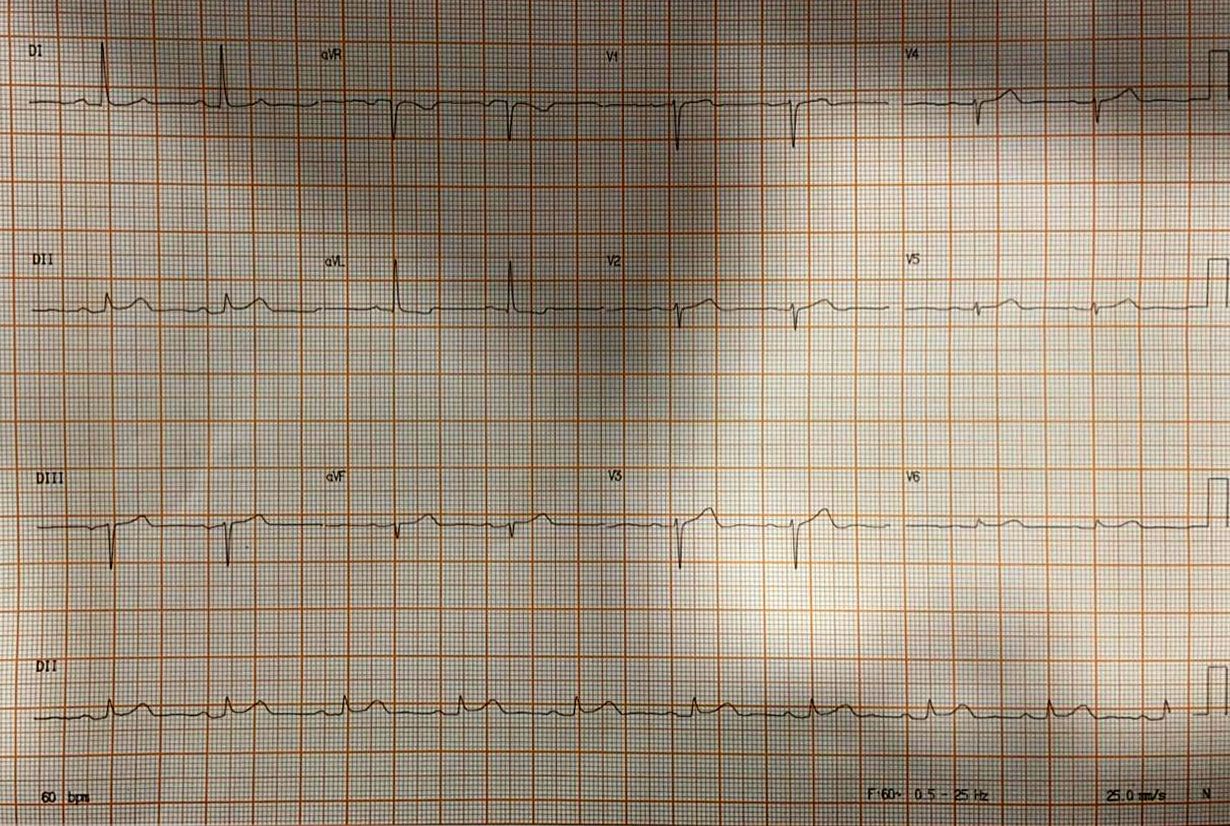 Ritmo sinusal. Eixo normal. Fc 60 bpm. Sem sinais de sobrecarga ou bloqueio de ramo. Progressão lenta de onda R nas Precordiais. Discreto supra em D2 e V6 (derivações não contíguas), Qtc normal