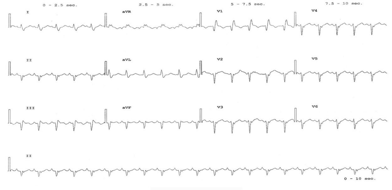 Ecg com taquicardia sinusal, S1Q3T3 e BRD com padrão qR