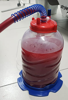 Após o diagnóstico do mau posicionamento do dispositivo, o acesso foi então retirado. Foi realizada drenagem torácica, com sucesso, e saída de cerca de 2 litros e meio de conteudo serossanguinolento (imagem 2).